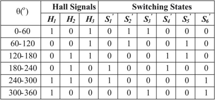 2.5PositionSensors: PositionsensorsinstalledintheBLDC motor detect the rotor’s position and convert it into an electricalsignal,whichprovidesthecorrectcommutation informationtothelogicswitchingcircuit.Commutationina BLDCmotorfollowsasix-stepsequence.Duringeachstep, the six switches in the Voltage Source Inverter (VSI) are turned ON and OFF in a specific pattern to generate six currentflowvectors.Thesevectorsadvancetherotorby60° eachtime.Toperformthiscommutation,Hall-effectposition sensors are used. These sensorsdetect the rotor position over every 60° span and generate three Hall signals. The signals are then decoded to produce the appropriate switchingpulsesfortheVSIswitches.Figure3.2.6illustrates the electronic commutator switching states. The Hall sensors are positioned so that they detect rotor magnet changes slightly before the rotor reaches the exact commutationpoint.Thisensuresthatcommutationoccurs justintime,preventingtherotorfromstoppingorgetting lockedinoneposition.