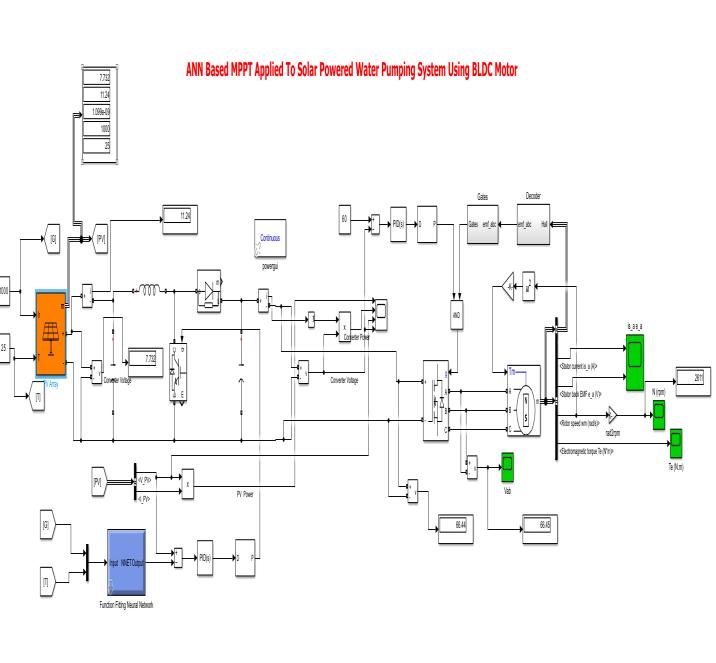 The two MPPT algorithms that are most commonly used when taking the water pumping system into account are incremental conductance (INC) and perturb and observe (P&O). However, in a standalone SPVWPS, the MPPT method's step size is a crucial component that governs control attributes [6]. In order to circumvent the detrimental impact of step size, the ANN-based MPPT techniqueischosen. Usingsolarphotovoltaic(PV)energy forpumpingisacost-effectiveandeco-friendlyalternative to diesel or grid-powered pumps [7]. A model of a solarpoweredcentrifugalpumpsystemdrivenbyaBLDCmotor, designedandsimulatedin MATLAB/Simulink.Themodel helps analysed system performance and optimize design parameters for efficient water pumping under different conditions.
