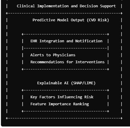 To enable smooth data flow across hospital systems, this research project implemented an API-driven integration layer that can communicate with common healthcare standards. Middleware built around FHIR and compatible platforms like OpenMRS handles the exchange of patient recordsandmodeloutputs.Theend-to-endpath,including model development, evaluation, inference, and API integration, is packaged in the implementation workflows. Forsiteswithtightcomputebudgets,thepipelinesupports parallelization via the joblib library, so preprocessing and inference can fan out across cores. To bolster external validity,generalization,andcurboverfitting,thetrainingloop used a 20-fold (k-fold) cross-validation. Operationally, the FHIRbridgeoperatesinarequest–responsepattern,where theEHRissuesaGETrequesttotheFHIRendpointforagiven patient, receives structured JSON as response, whilst the modelserviceperformspredictionandinterpretability,and the API posts the results back into the EHR for clinician