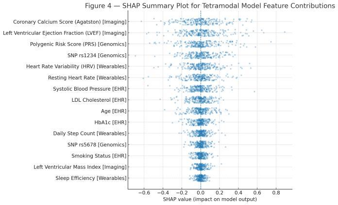 SHAP analysis revealed that imaging features (coronary calcium score, left ventricular ejection fraction) were dominantforonsetprediction.Genomicpolygenicriskscores and SNP variants ranked highly for both onset and progressiontasks.Wearablesfeatures,HRV,andrestingheart rate contributed strongly to regression outcomes. EHR features such as systolic blood pressure and cholesterol levelsremainedcriticalpredictors.