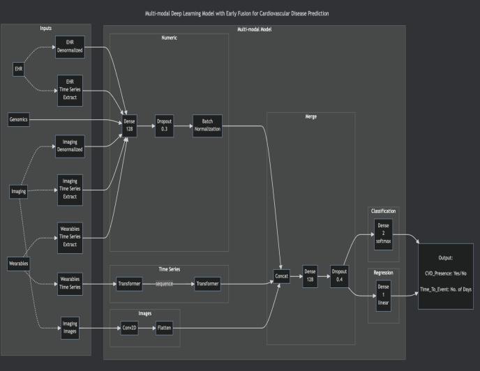 Modality-specific subnetworks were incorporated into the model architecture. For instance, a Convolutional Neural Network was applied for imaging, together with ReLU activation.Transformerencoder(multi-headself-attention, position encoding) was created for wearables, and fully connecteddenselayersforEHRandgenomicsdata.Theearly fusion technique was applied by concatenating modalityspecific embeddings, followed by fully connected layers. Dropout and batch normalization were applied to reduce overfitting.Fortheoutputs,CVD_Presencerepresentedthe classificationtableheader,whilstTime_To_Eventrepresented theregressiontableheader.