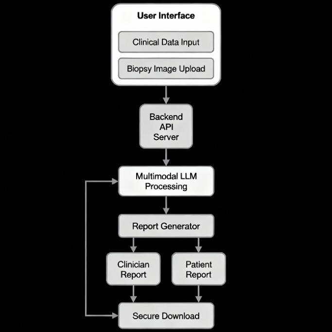 performance in integrating textual clinical data and liver biopsy images, producing coherent and contextually relevant diagnostic summaries. The generated clinicianoriented reports consistently included accurate likelihood estimations of AIH, well-structured differential diagnoses, and concise interpretative remarks reflecting clinically meaningfulreasoning.Similarly,thepatient-facingreports effectivelytranslatedtechnicalterminologyintoaccessible language, improving interpretability and educational value. Preliminary usability testing with a small group of clinicians and students indicated that the web interface was intuitive and required minimal training. Processing time per case averaged under one minute, including file upload, AI inference, and PDF generation, confirming the system’s suitability for near-real-time clinical support. These results collectively validate the technical feasibility andpractical utilityofa multimodal largelanguagemodel (MLLM)-basedsysteminhepatologydiagnostics.