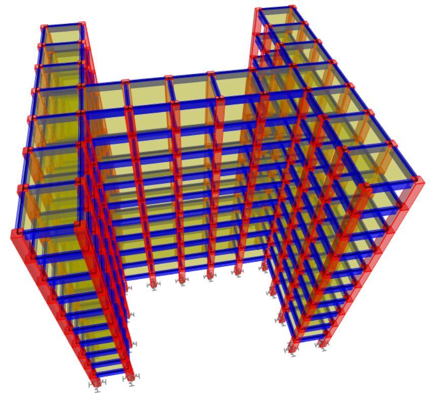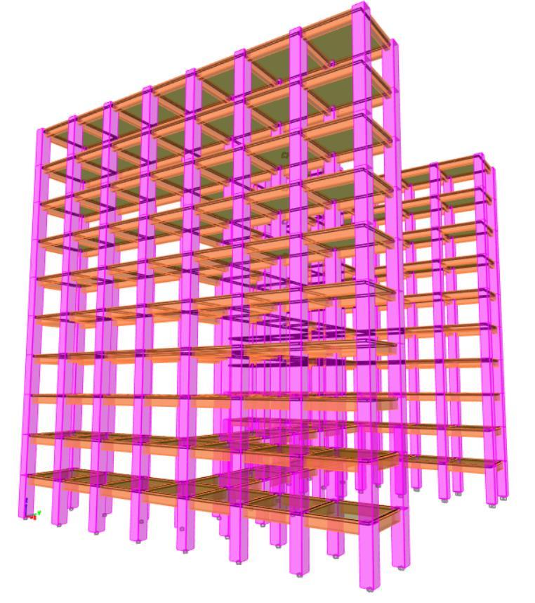ETABS21.2.0isusedtocreate&analyzea3Dmodelofa10story reinforced concrete (RC) structure. Beams and columnsarerepresentedasbeamelements,eachhavingsix degreesoffreedomattheirnodes.Theslabfunctionsshellas a rigid diaphragm, distributing horizontal forces to the columns.Steelismodeledusingbarelements,whileconcrete is represented as beam elements, with perfect bonding assumedbetweenmaterials.Thelineelementsincorporate materialgradesofM30forconcreteandFe500forsteel.