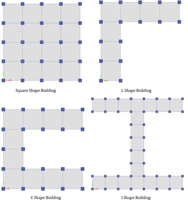 TheabovesnapshowsthedifferenceshapemodeledInthe Etabssoftware.Thesquarebuildingshowssymmetryfrom allfoursidesofthebuildingandtheIshapebuildingshows thesymmetryaboutthehorizontalaswellasverticalaxisof the plan. However, the L and C shape building shows the unsymmetricandshowsonere-entrantcornerintheLshape buildingwhereastheCshapebuildingshowsthe2re-entrant cornerinthesamebuilding.Thecentroidofthebuildingof every shape has different location in the plan which may further cause variation of the load distribution in the structureandprovidethedifferentstructuralbehavior.