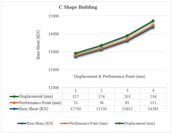 Chart 3: Chart shows the relation of base shear vs displacement&performancepointforCShapeBuilding.