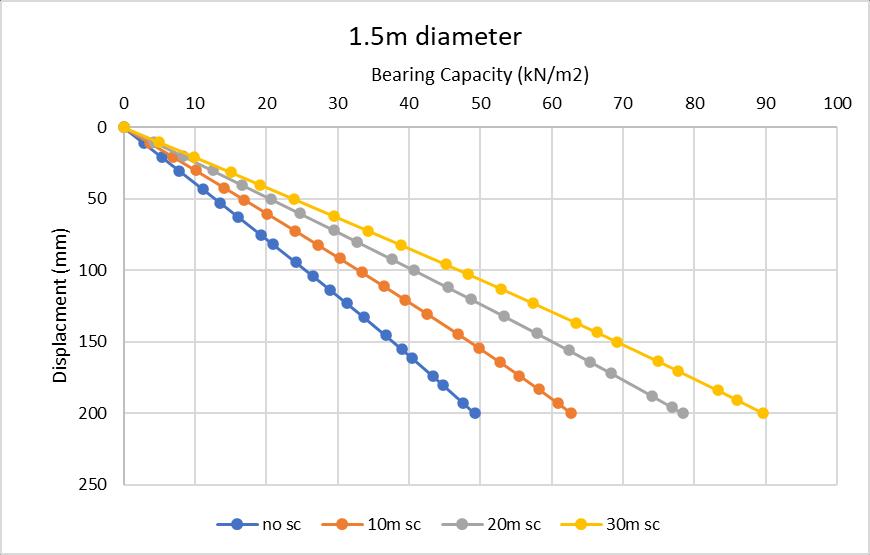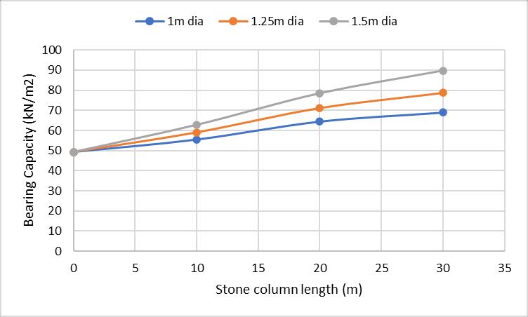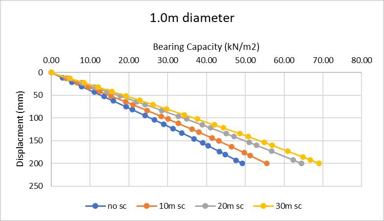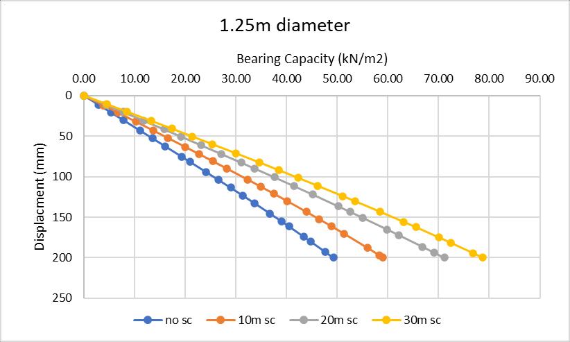 The graph below shows the bearing capacity of the soft soilfor200mmdisplacementwithincreasinglengthofthe stone columns (10m, 20m & 30m) with 1.0m, 1.25m, and 1.5mdiameters.