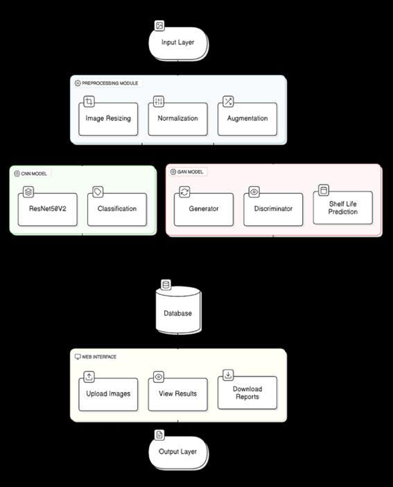 Generative Adversarial Networks consist of two neural networks in a competitive learning process - a generator that generates synthetic images and a discriminator that evaluates their realism. Through adversarialtraining,thegeneratorcontinuouslyimprovesits abilitytogeneraterealisticsamplesthatcloselyapproximate thestatisticaldistributionofthetrainingdata.Inthecontext of this fruit quality assessment system, GANs serve two significantpurposes.First,theyaddressdatascarcityissues bygeneratingrealisticvariationsoffruitimagesatdifferent stagesofripeness, effectivelyaugmentingthetrainingset. Second,theyenableshelf-lifeestimationthroughmodeling thetemporalprogressionoffruitspoilage.Theadversarial trainingprocessensuresgeneratedimagesarebiologically plausiblewhilecoveringedgecasesthatmightbesparsein theoriginaldataset,thusenhancingthemodel'srobustness.
