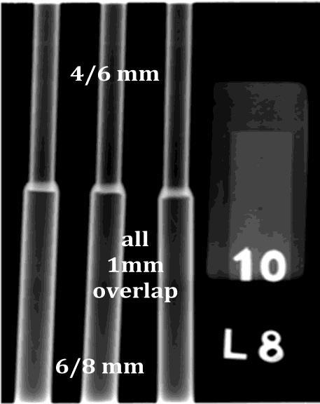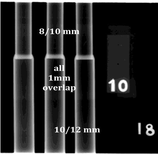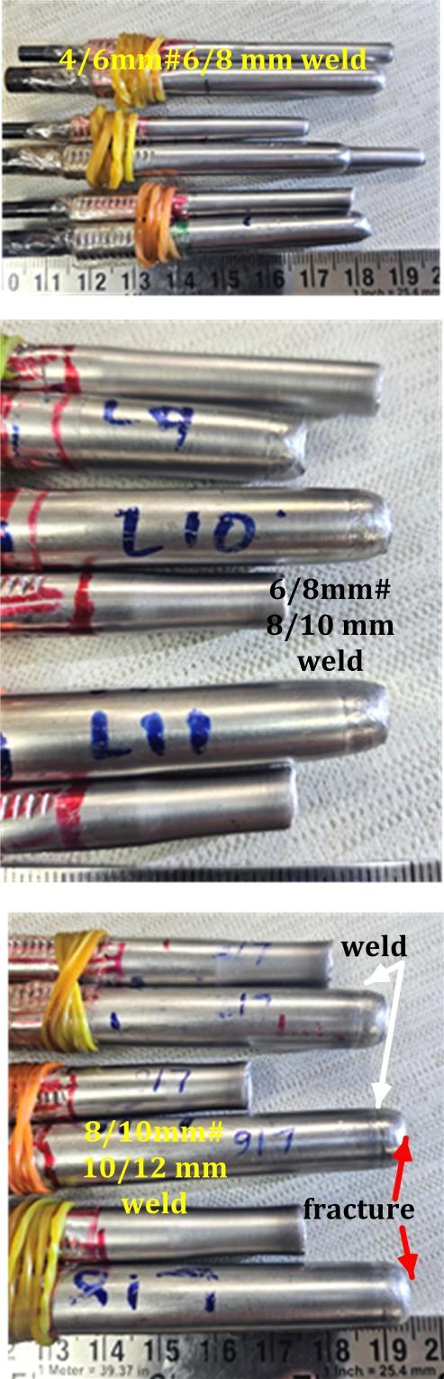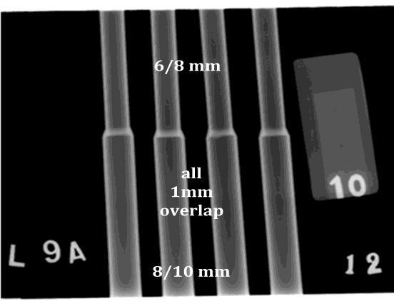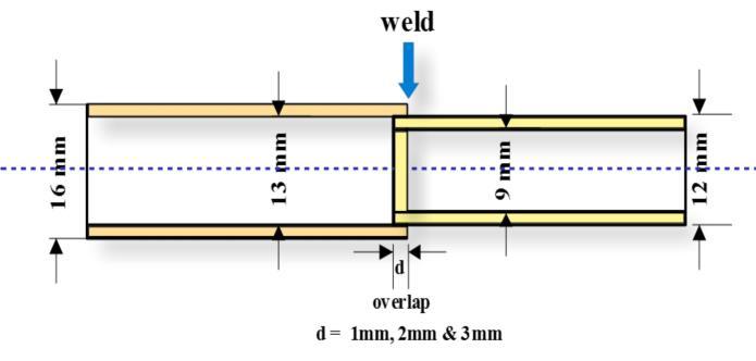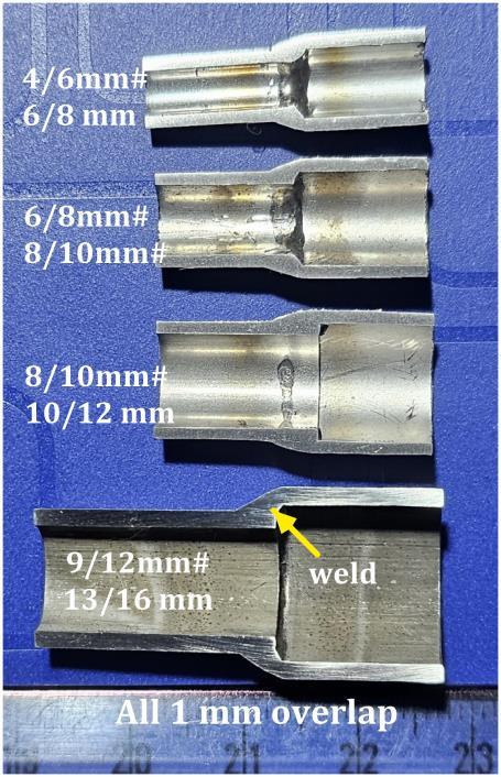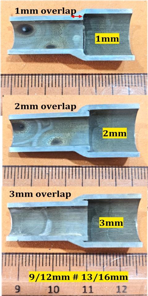 Figure-4 shows the welded samples with 1 mm, 2 mm and3mmoverlap,forthejointconfigurationof4/6mm,6/8 mm, and 8/10 mm. Visual observation of the joint shows smooth bead convex surface profile with excellent coalescence. Figure-5 shows the cut sections of all weld configurations for 1mm overlap. Figure-6 shows the cut sectionsoftheweldedjointsforthe9/12mm#13/16mm tube joint configuration. The average length of the fusion overlap, as shown by double-headed arrow in Figure-6, measuredis4.18mmfor1mmoverlap,3.68mmfor2mm overlapand3.63mmfor3mmoverlap.Butthiseffectmay be ignored as the measurement was made on two cutsurfaces. Also, when we consider the entire length of the circumferentialweld,alltheoverlaplengthmaybewithin ±10%ofvariation