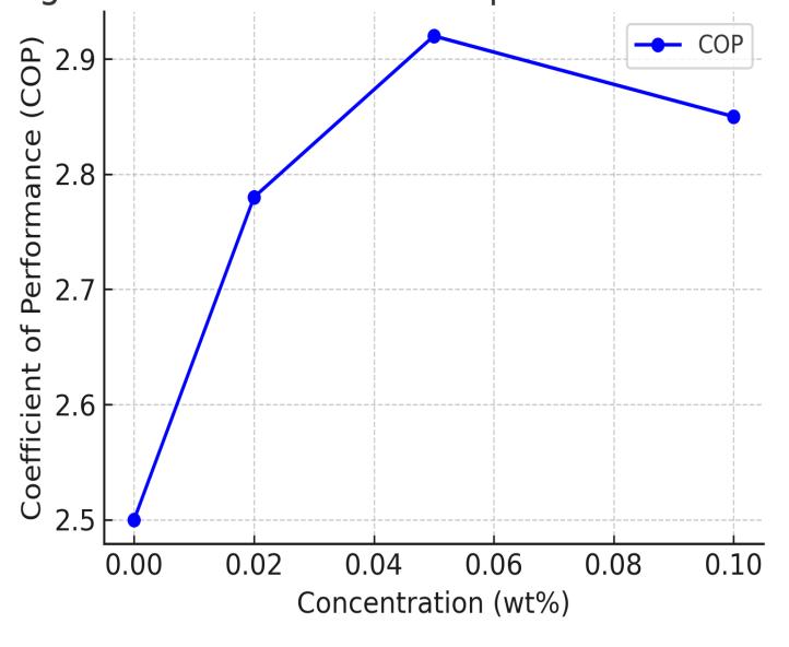 The Coefficient of Performance (COP) increased significantlywithnanocompositeconcentration,peaking at2.92for0.05wt%,representinga16.8%improvement overthebaselinevalueof2.50.