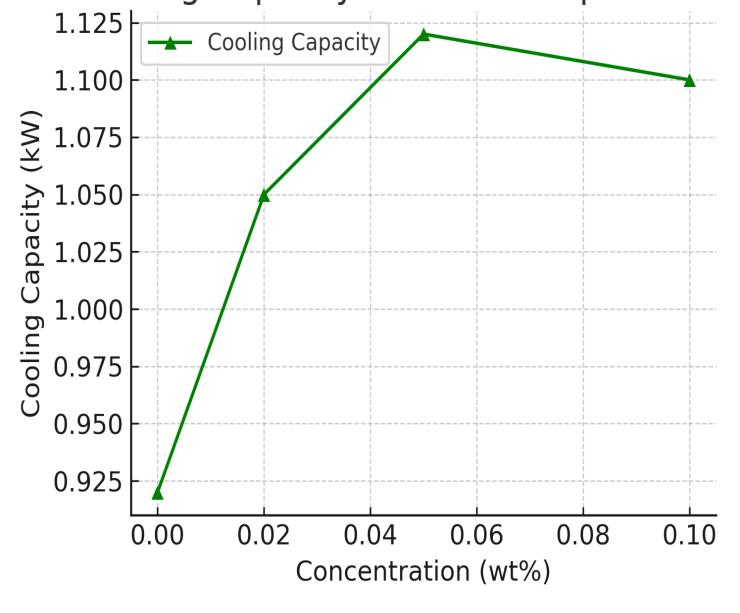 Figure3showstheCoolingcapacityimprovedfrom0.92 kW (baseline) to 1.12 kW at 0.05 wt%, representing a 21.74%increase.Theimprovementisexplainedby: