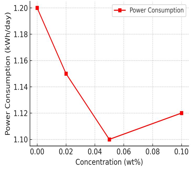 Figure 2 shows that energy use decreased with nanoparticle concentration up to 0.05 wt%. The lowest energy consumption recorded was 1.10 kWh/day (8.33% less than baseline). The reduction is attributed to: