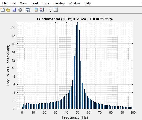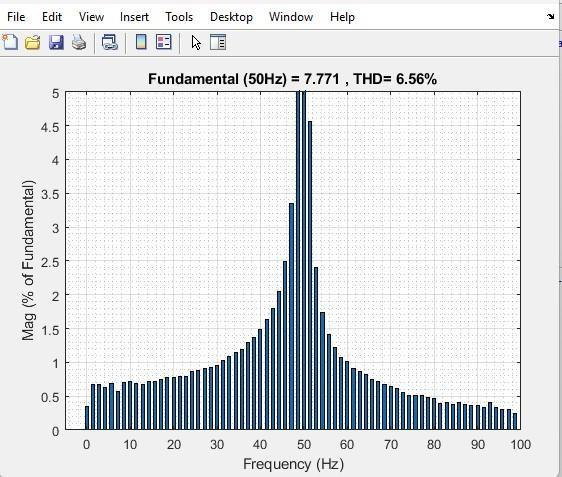 TheFFTanalysisofthe5-levelinvertershowsafundamental frequency at 50 Hz with a magnitude of 7.77and a THD of 6.85%, which is good. The waveform contains very few harmonics,indicatingitisveryclosetoapuresinewave. To further improve, you need better filtering or advanced inverter modulation techniques (like SPWM or multilevel inverterdesign).Figure4.10showstheFFTAnalysisofa5levelinverter.AccordingtoIEEEStandards,THDofVoltage andCurrentshouldbebeloworEqualto5%and4%.
