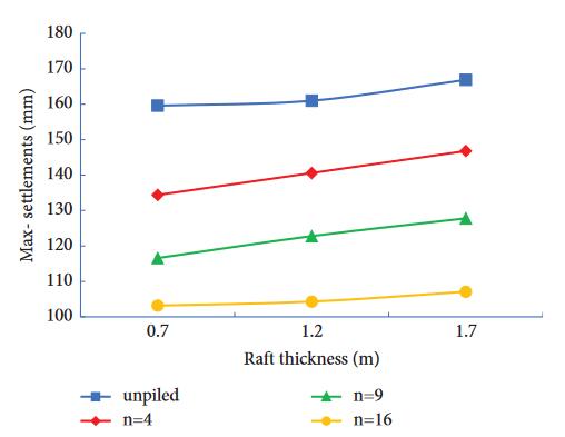 Effect of Raft Thickness: - The effect of raft thickness on settlementwasinvestigatedthroughvaryingraftthicknesses
