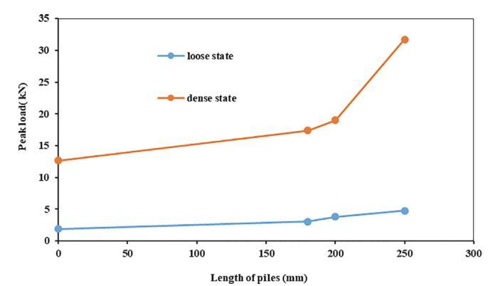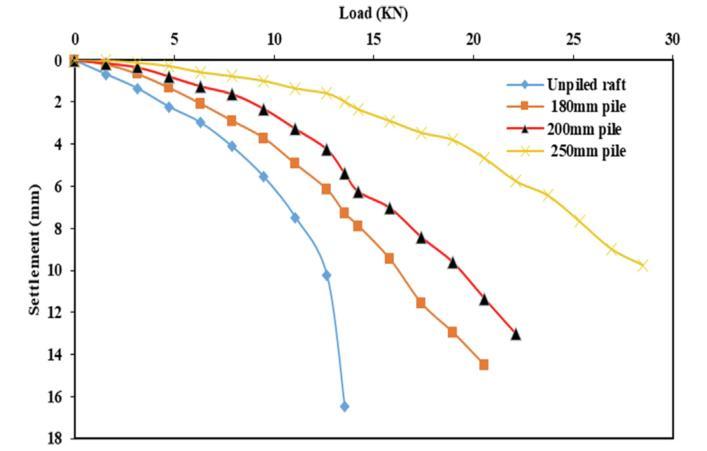 Figurebellowsindicatestheloadsettlementgraphof200_ 200mmraftwith180mm(short),200mm(medium)and 250mm(long)pilesinlooseanddensestateofsoilwith4 numbersofpiles.