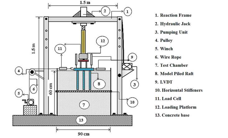 Thestudyfocusesonthebehaviorofapiledraftfoundation system under vertical loads on cohesionless soil. The experimental setup involved square rafts (200 mm × 200 mm)withvaryingpilelengths(180mm,200mm,250mm) and pile numbers (4 and 9). Tests were conducted under looseanddensesoilconditionsusingahydraulicjackforload applicationanddialgaugesforsettlementmeasurement.The soil'sdensitywascalibratedforloose(1.53g/cc)anddense (1.84 g/cc) states, with sand prepared as a well-graded medium. Total 14 test where conducted. The vertical load wasgivenwithahydraulicjackof700kg/cm3.