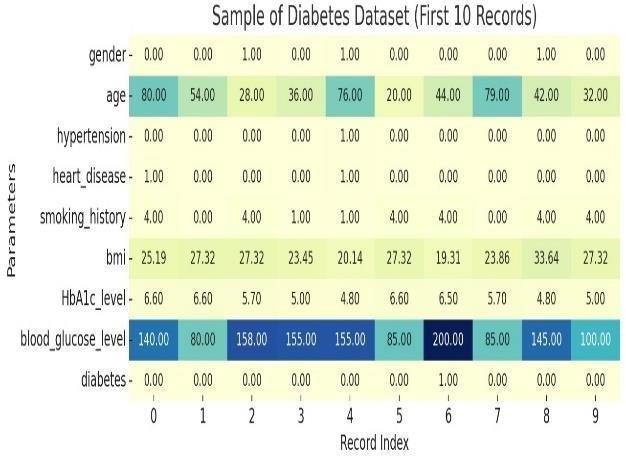 In this study, we make use of a sizable Kaggle dataset that contains a range of medical records relevant to diabetes prediction. For example, blood sugar, body mass index, HbA1c, smoking history, age, gender, heart disease,andhigh bloodpressure. This dataset allows for morerigoroustrainingandevaluationofmodelsbecause it is larger and more diversified than the popular Pima Indians Diabetes Dataset. The objective variable is "Diabetes"(0=no,1=yes).