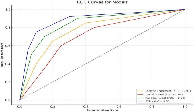 Fourcategorizationmodelsarecomparedinthissection: Support Vector Machine (SVM), Random Forest (RF), Decision Tree (DT), and Logistic Regression (LR). The same preprocessed dataset was used for training all models, and the same train-test split (75:25) was used for evaluation. Area Under the ROC Curve (AUC), F1Score, Accuracy, Precision, and Recall are the main performancemetricsthatareused.