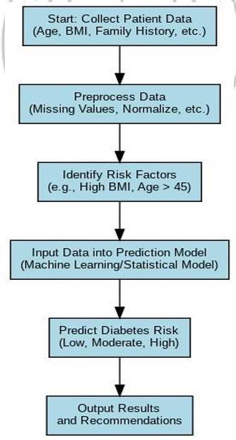 The following gives the detailed work and procedure of implementation. Data Preprocessing: (i)Handling Missing Data.(ii)Imputationtechniquessuchasmean,median,ork NN imputation. Feature Selection: (i)Identify and retain only the most significant predictors of diabetes. (ii)Normalization and Scaling: Standardize features to ensure consistency across models. Model Development: (i)Supervised Learning Models: Logistic regression, decision trees, support vector machines and random forests. Performance Evaluation: (i) Compare models basedonaccuracy,precision, andrecall. Visualizationand Interpretability:FeatureImportanceAnalysis:Identifythe most influential variables in predicting diabetes. Web Application: A user-friendly interface for clinicians and researchers.