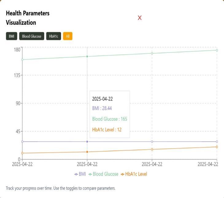 Thevisualizationenablestovisualizetheriseandfallof parameter values based on prediction history Though the interface allows visualising the trends in parameters, the relation between eachofthe attributes thatdetermine the existenceofdiabetesisalsoexamined.