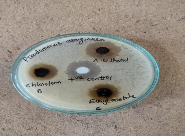 The given sample shows the antibacterial activity against pathogenic microorganisms, such as Staphylococcus aureus (20 mm) and Pseudomonas aeruginosa (21 mm). The ethanol extract demonstrated significant antimicrobial activity against both Staphylococcus aureus and Pseudomonas aeruginosa compared to the chloroform and ethyl acetate extract. Among the extracts tested, the ethanol extract showed the highest efficacy, while the ethyl acetate extract. Extract exhibitedtheleastantimicrobialactivity.