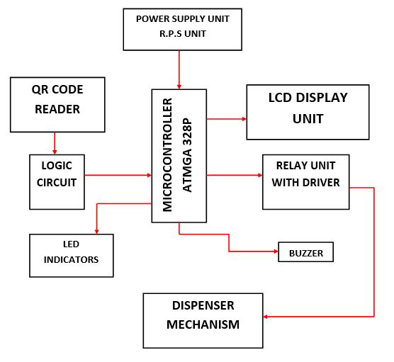 The system architecture of the QR Code Scanning-Based Medicine Vending Machine is designed to provide an efficientandautomatedsolutionfordispensingmedicines. At its core, the system utilizes an embedded QR code scanning module to read prescriptions encoded in QR codes, which are linked to patient profiles or doctorprovided prescriptions. The scanned data is transmitted to an ATMEGA328 microcontroller, which acts as the centralprocessingunit,controllingtheentiresystem. The microcontroller interfaces with various components, including relay drivers for operating the dispensing mechanism,anLCDdisplayforuserfeedback,andsensors such as IR sensors to detect user interaction. A servo motor is employed to physically dispense the medicines, while a buzzer provides alerts during the dispensing process or in case of errors. The system is powered by a regulatedpowersupplyunitthatdelivers+5Vand+12Vto the components, ensuring stable operation. The communication between the QR scanner and the microcontroller is facilitated through a UART/Serial connection, and the software is programmed using Arduino-based code to manage the scanning, dispensing, and user interaction processes. The methodology for developingtheQRCodeScanning-BasedMedicineVending Machinefollowsa structuredapproach.It begins with the initiationphase,whereprojectgoals,scope,andobjectives are defined, followed by the planning phase, which involves establishing system requirements, stakeholder involvement, and timelines. The designing phase focuses on creating detailed specifications for hardware and software, user interface designs, and prototypes. In the developmentphase,hardwarecomponentssuchastheQR scanner, microcontroller, relay, and sensors are integrated, and the system is programmed and tested for functionality. The control phase ensures final testing, quality assurance, and regulatory compliance before deployment. Once the machine is built and installed, testing and validation are conducted to ensure reliability, functionality, and performance. Risk monitoring and control are implemented throughout the project lifecycle to address potential challenges such as hardware malfunctions,datasecuritybreaches,anduserresistance. Finally, the system is maintained through regular monitoring, medicine refills, and software updates to ensure its continued efficiency and effectiveness. This comprehensive methodology ensures the successful implementation of the vending machine, addressing user needs, technical constraints, and compliance requirements.