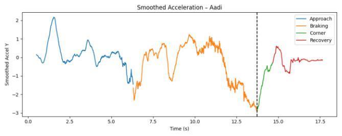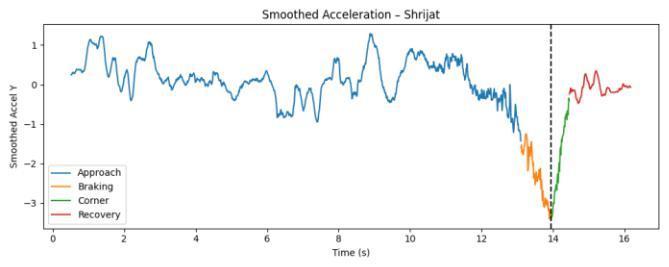 Fig-1:Longitudinal(Y)accelerationvstimeforan experiencedrider.Themaneuverissegmentedinto Approach(blue),Braking(orange),Corner(green),and Recovery(red).ThedashedverticallinemarksPeak Deceleration.Units:accelerationinm/s²;timeins.
