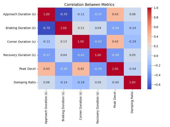 Fig-6: Pearson correlation matrix across extracted features: Approach Duration, Braking Duration, Corner Duration,RecoveryDuration,PeakDeceleration,Damping Ratio. Values annotated (–1 to +1). Strong negative correlation between Approach and Braking durations highlightsastrategytrade-off.