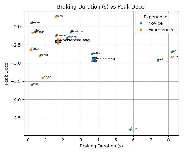 Fig-3:ScatterofBrakingDuration(s)vsPeakDeceleration (m/s²) for all riders, colored by Experience. The “Novice avg” (X marker) and “Experienced avg” (plus marker) showcohort means.More negativevaluesindicateharder braking.