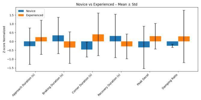 Fig-7: Group comparison of z-score normalized metrics with mean ± standard deviation for Novice and Experienced cohorts. Experienced riders show shorter Braking/Recovery durations and higher Damping Ratios onaverage.