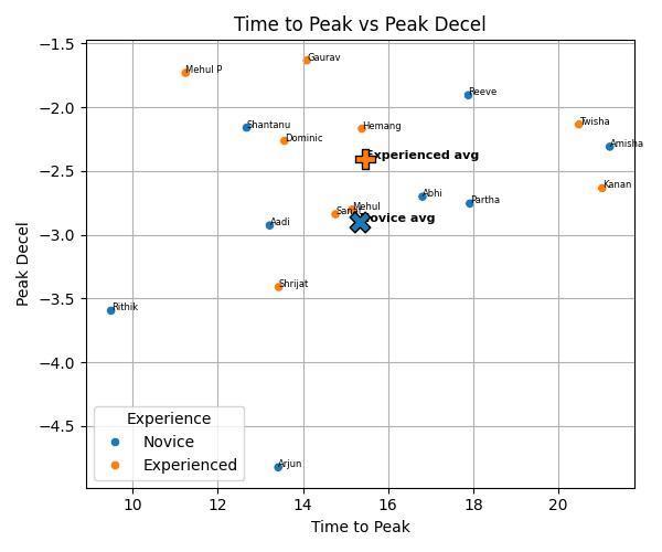 Fig-4: Scatter of Time to Peak (s) elapsed time from brake onset to peak vs Peak Deceleration (m/s²). Points coloredbyExperience.CohortmeansshownasNoviceavg (X)andExperiencedavg(plus).