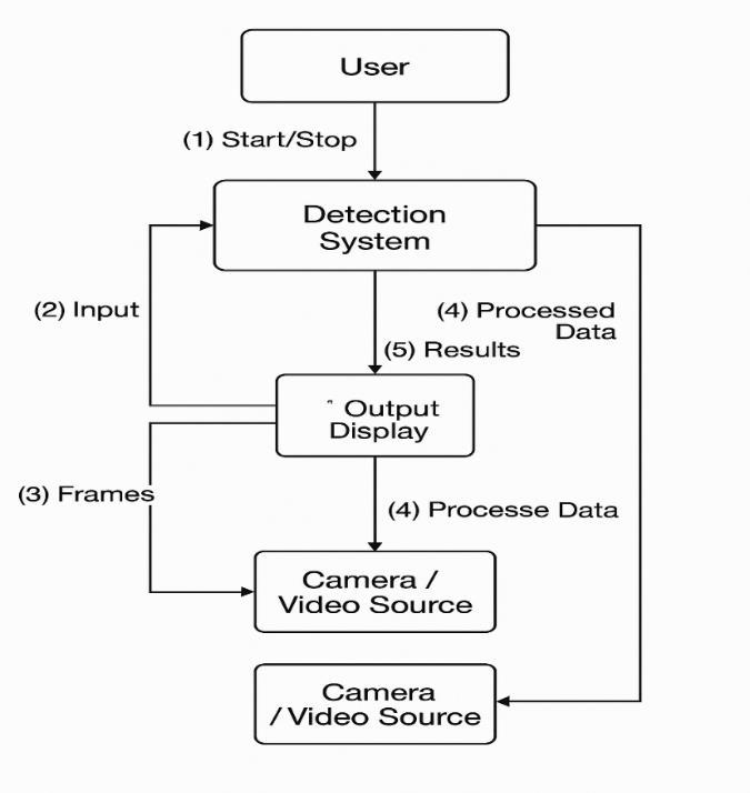Thesysteminteractswithhardwarecomponents(camera, GPU/CPU,displaymonitor)andsoftwarelibraries(OpenCV, PyTorch/TensorFlow,YOLOv8).