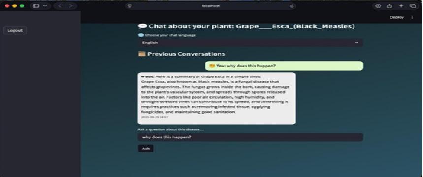 Themodelenoughtrainedinthecontextrightinitsfarmingadvice.Theaccuracyisabout92%accurate, onaverage.It managedeverylanguageforthosetheytrainedwhetheritisTamilandHindiwhicharethebestlanguages.Itstilldidworkgood withlanguageslikeKonkaniandMaithilieventhoughitwasn’tcompatible.Whenfarmersworkingwithit,85%feedbackthat theyfindhoweasyitwastotalkto,nomatteriftheylivedclosertocityorwayoutinthefields.