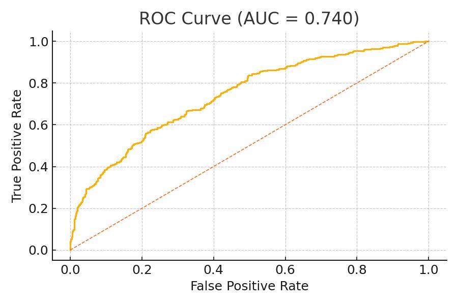 Modelperformance:AUC=0.740;Accuracy=0.733.Confusionmatrix(predictedvsactual): [[626,66],[208,125]]