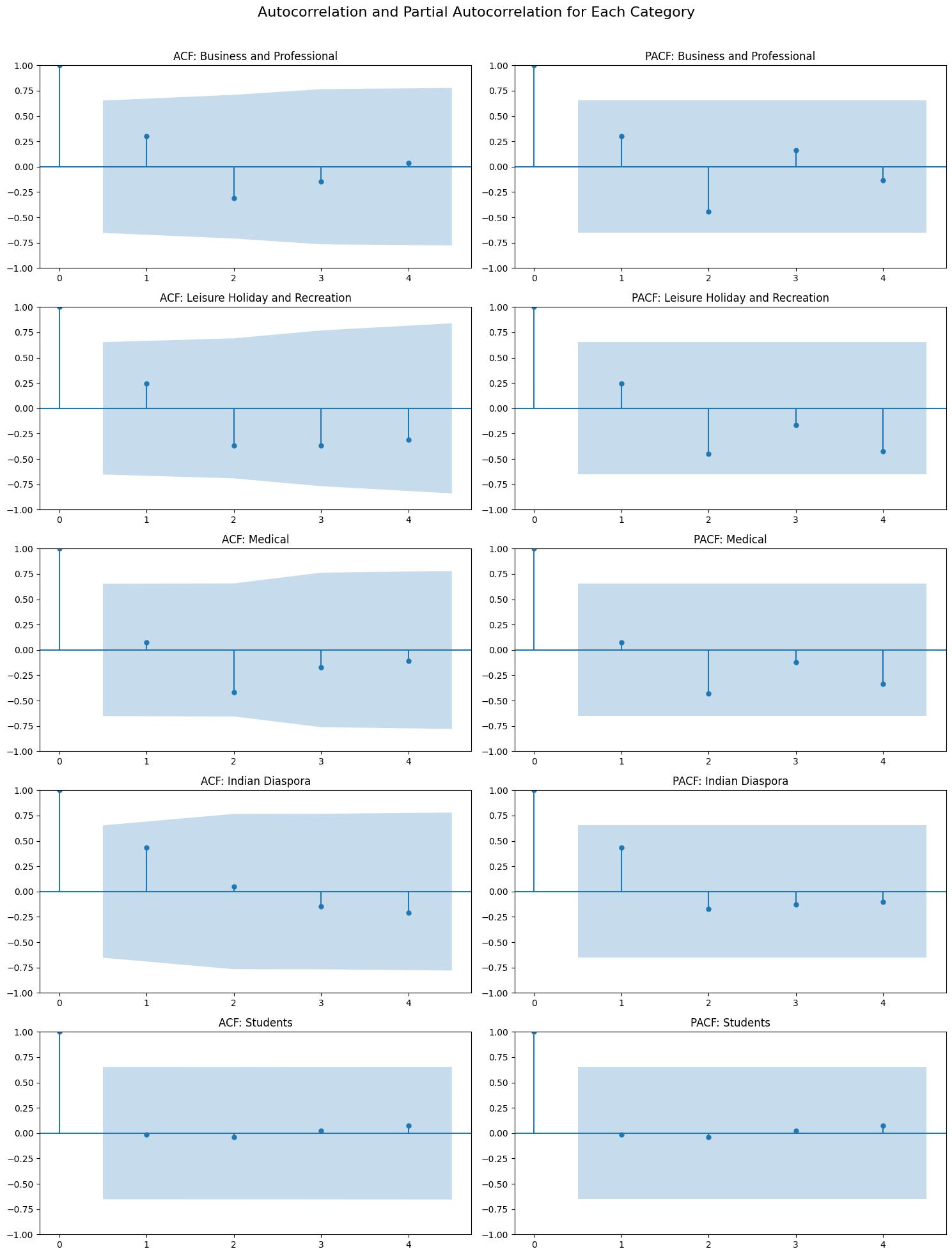 The tourist arrivals and forecasts analysis in Figure 6 shows a steady rise in all categories before the pandemic, largely sustainedbyglobalizationandtheattractionoftourisminIndia.Thelatterledtoa sharpcontractionduringthepandemic years 2020 and 2021. While growth is observed during 2022 led by medical tourism and Indian diaspora, most other categories are still below pre-pandemic levels, with the exception of Students. In summary, the confidence intervals for Leisure Travel are wider, indicating high sensitivity to global economic and policy changes (Ahmed, Amin & Khan, 2020) whereastheintervalsforMedicalandStudentsaremorenarrowandpointtostabletrends. TheARIMAmodelanalysisof tourist arrivals highlights key post-pandemic trends across various segments: Business Travel is expected to stabilize at lower levels due to the rise of virtual meetings and ongoing economic challenges. While Leisure Travel shows signs of recovery,itremainshighlyvolatilewithbroaderconfidenceintervals,reflectingitssensitivitytoeconomicconditionsand externalfactors.MedicalTourismisforecastedtoexperiencestable,predictablegrowth,supportedbyIndia’sreputationas an affordable healthcare destination, with narrow confidence intervals suggesting consistent demand. Indian Diaspora travel isanticipatedtorecover slowlybutsteadily,influencedby migrationtrendsandthegradual normalizationofpostpandemictravel.Finally,theStudentsegmentshowsaslowrecovery,affectedbyvisaandeducationpolicychallenges,with narrowerconfidenceintervalsindicatinglessvariabilityinforecasts.
