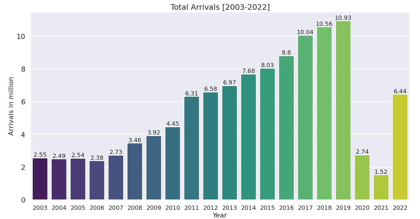 Figure 1 TotalnumberofarrivalstoIndiafrom2003to2022