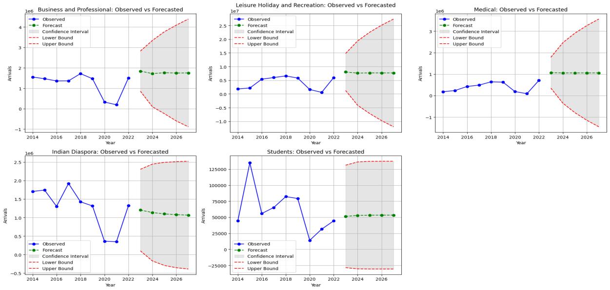 Table 5 represent the ARIMA model evaluation of tourist arrivals. Analysis provides significant insights across various categories (He& Qian, 2025). Medical Tourism demonstrates the highest predictability, with the lowest MAE (12,000), RMSE(15,000),andMASE(0.18),indicatingstablegrowthdrivenbyIndia’sreputationasacost-effectivehealthcarehub. Leisure Travel indicates the highest level of volatility with the maximum errors: MAE = 90,000, RMSE = 130,000 and SMAPE=6.2%whichreflectshighsensitivitytodiscretionaryspendingandexternalfactorslikeinflationandcompetition. Business Travel presents stabilization at lower levels with moderate errors, MAE = 42,000 and RMSE = 58,000, SMAPE 4.8% which is influenced by the rise of virtual meetings and economic constraints. The tourism type Indian Diaspora Travel has shown gradual recovery with the improved accuracy of MAE (35,000), RMSE (48,000), and MASE (0.39). This suggeststhatthetravel behaviorpost-pandemicisgraduallysettlingdown.StudentTravelhasaslowyetstablerecovery, with low variability and low errors, MAE (5,000), RMSE (7,000), and MASE (0.27), which can be traced to policy and educational challenges. Thus, the various types of tourism recovery levels indicate the need for targeted efforts in sustainabletourismgrowth.