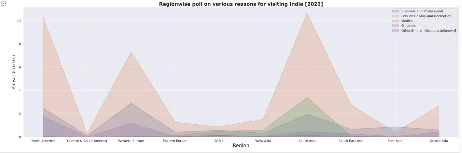 Figure5highlightstheregionalbreakdownoftouristarrivalsinIndiafor2022.NorthAmericantouristsprimarilyvisitfor leisureandbusiness,reflectingtheirhigh-valuecontribution.WesternEuropedominatesinculturaltourism,withnotable business-related visits. South Asia leads in medical tourism due to India's affordable healthcare, alongside family and diaspora-related travel. Central & South America, focusing on leisure, shows minimal arrivals due to distance and connectivityissues.Africahasgrowingmedicalandbusinesstourism,whileAustralasiacontributesfewerarrivals,largely forleisure.