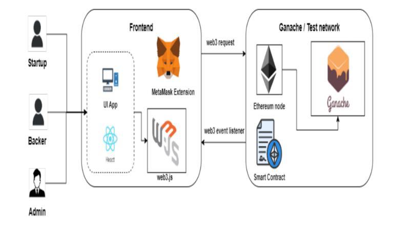 BlockchainBackend: Smartcontractsdeployed on Ethereum(testedvia Ganache) to enforce funding rulesandensureimmutablerecord-keeping.