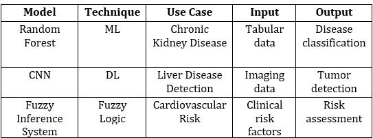 AI and ML techniques have been applied in diagnosing differentdiseases,includingchronicdiseasessuchasheart andkidneydiseasesandcancer,andneurologicaldisorders. OneofthepapersbyGuptaandSharma(2024)focusedon thesystematicreviewofAImodelsappliedtoheartdisease prediction.[10]Thestudythereforefocusesmostlyonthe applicabilityofartificialintelligenceinanalyzingextensive datasetswithaviewtoaccuratelydiagnosingcardiovascular diseases.SupportVectorMachines(SVM)andDecisionTrees (DT)werespecificexamplesofmachinelearningmodelsthat wereidentifiedasgivinggoodresultsfortheprediction of heart disease given demographic, lifestyle and clinical parameters.