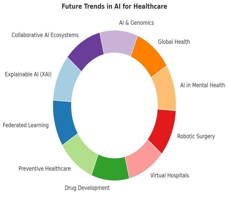 The integration of Artificial Intelligence (AI) in healthcare is expected to grow exponentially, driven by advancements in technology and the increasing demand for efficient, personalized medical care. Below are some key future trends that are likely to shape the future of healthcare: