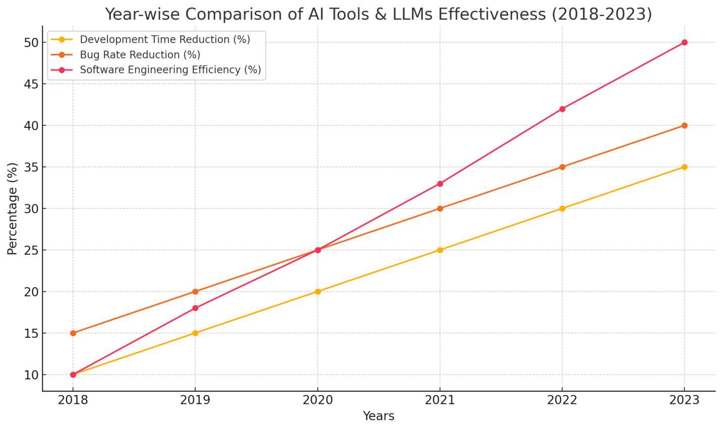 Fig5:Ayear-wisecomparisongraphshowcasingthetrendsinDevelopmentTimeReduction,BugRateReduction,and SoftwareEngineeringEfficiencyfrom2018to2023.