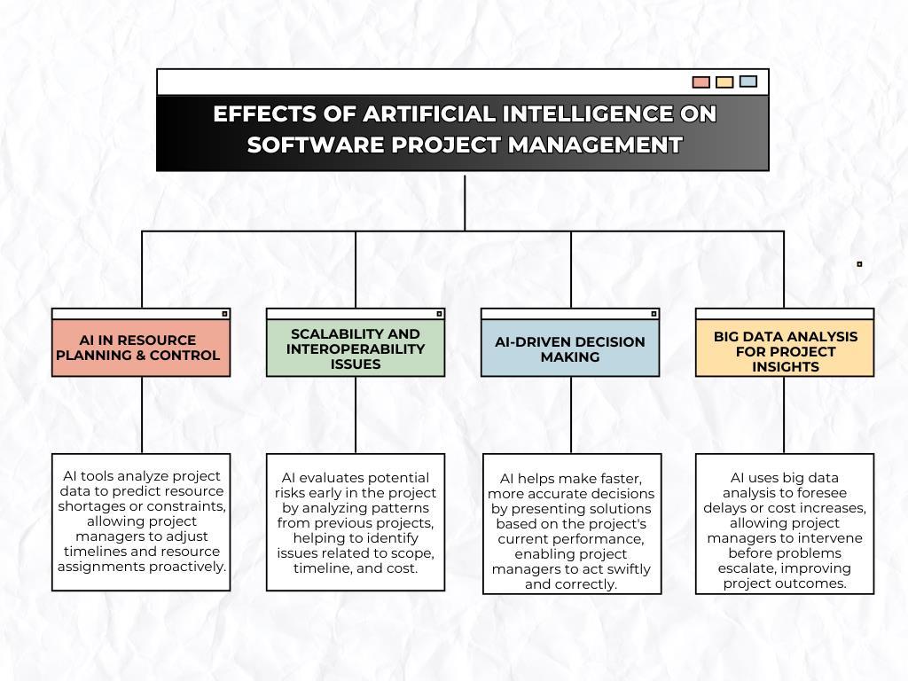 There are now advances in applying AI in software project management tools where expertise is needed in managing resources,riskevaluations,anddecision-making.AdvancedanalyticssolutionsareoftenbuiltintoAIprojectmanagementand helppredictandflaganylikelydelayorcost over-run beforetheyhappen.For instance,usinghistorical data,AIcanidentify thatresourcesarelikelytobescarceinaparticularperiodorthattheprocesswilllikelyhaveabottleneckinthatperiod,and theteamscanthencorrecttheirtimelines(Schwabeetal.,2020). Moreover,AImodelsareinstrumentalinenhancingproject riskevaluation,astheyassistinidentifyingpotentialrisksearlyinthedevelopmentprocess.Byleveraginghistoricaldatafrom previousprojects,AIandMLtoolscanpredictrisksrelatedtoprojectscope,time,andcost.Shah(2019)discusseshowAIand ML can streamline the risk management process by providing predictive insights, which help software engineering teams to proactively address challenges. These AI-driven models improve decision-making by offering data-driven forecasts, thus minimizingprojectdelaysandcostoverruns.