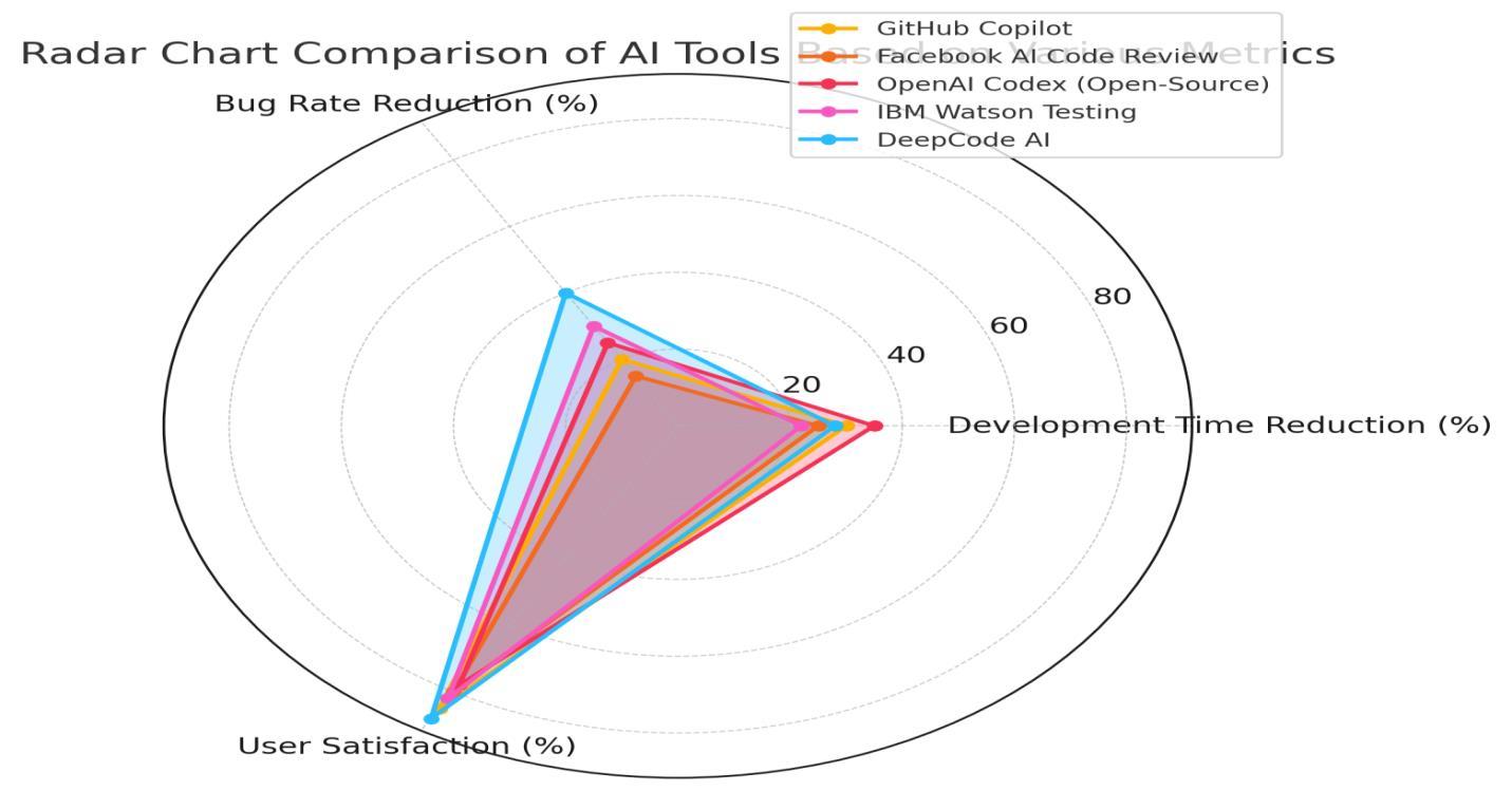4:RadarChartcomparingthedifferentAItoolsbasedonthethreemetrics:DevelopmentTimeReduction,BugRate Reduction,andUserSatisfaction.