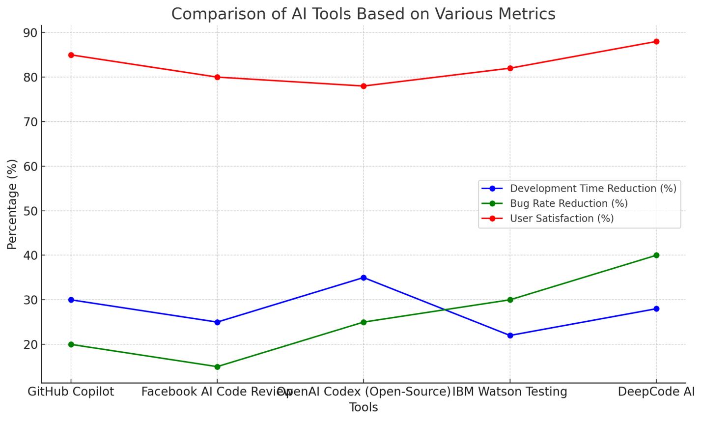 3:linegraphcomparingtheAItoolsbasedontheirDevelopmentTimeReduction,BugRateReduction,andUser Satisfactionmetrics.