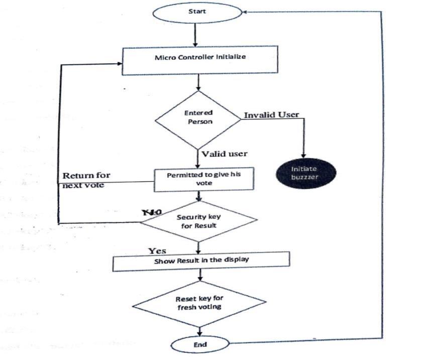 A block diagram representation schematically describes the flow of input (voter actions) to processing (microcontroller logic) and output (LCD display and resultstorage).
