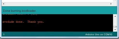 Inthe ArduinoIDEopentheTools menu andselectArduino UNOundertheBoardsettings.Afterthat,choosethecorrect serial port that is connected to your device. Then set the Programmer option to Arduino as ISP. Once all configurations havebeensetandthenuse thetoolsmenu to burnthe boot loader. The IDE will thenshow a message that indicates the writing of the boot loader to the target board, and it may be need a short duration to complete. Success boot loader messageOncethebootloaderisinstalled,aconfirmation