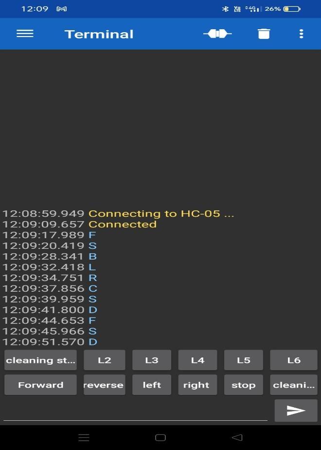 Wecontrolledthemovementofthesolarpanelcleaning robot using the HC-05 Bluetooth module, which facilitates wireless communication between the robot and a smartphone.Asdepictedinfig4.SerialBluetoothTerminal app, available on Android devices is used. It serves as the interfaceforsendingcontrolcommands.Throughthisapp, serial commands are transmitted to the HC-05 module, whichcommunicateswiththerobot'smicrocontroller.The commands like forward, reverse, left, right, stop, cleaning start, cleaning stop are provided and for each command specific letters like F (Forward), S(stop), B(Backward) are used. The microcontroller processes these commands to control the motor drivers, enabling precise control of the robot'smovements.