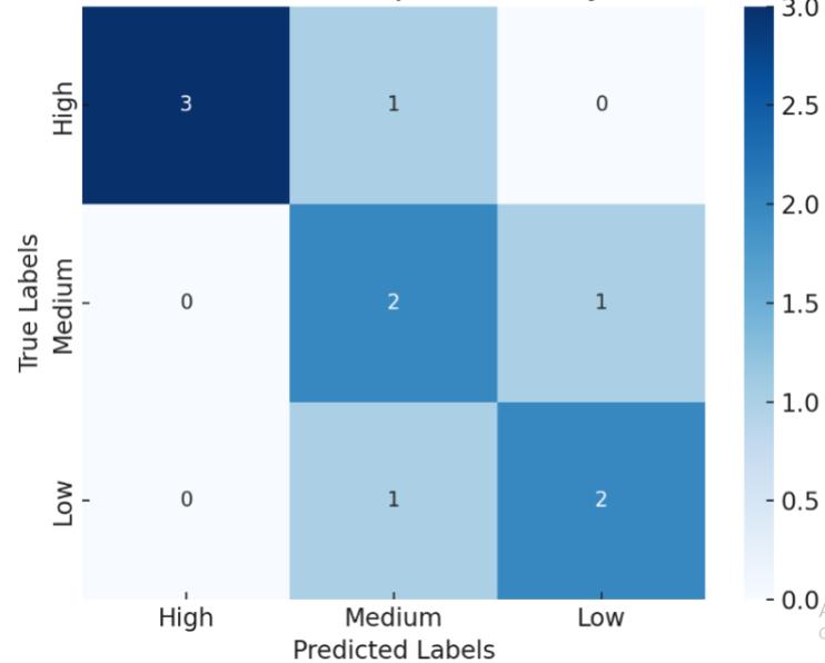diagonal indicate that classification is aligned effectively, especially for the “High” class. The off-diagonal values representtheerrorsassociatedwithpredictionsandthese are much lesser as compared to the main diagonal which showsthatitisreliable.Thesepatternsofconfusionimply that the model is able to discriminate based on fluency and relevance of the caption, but may need to be finetunedforlower-levelsemanticdifferences.