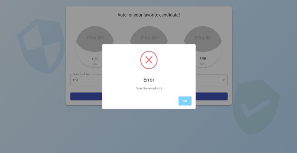 The error in the Figure 5 shows "Failed to record vote" occurs because the system detected multiple voting attempts, whichviolatesvotingrulesdesignedtoensurefairness.VotingplatformsoftentrackuseractionsusingIDs,IPaddresses, cookies,ordatabaserecordstopreventduplicatevotes.Whenausertriestovotemorethanonce,thebackendrejectsthe request,triggeringthiserror.