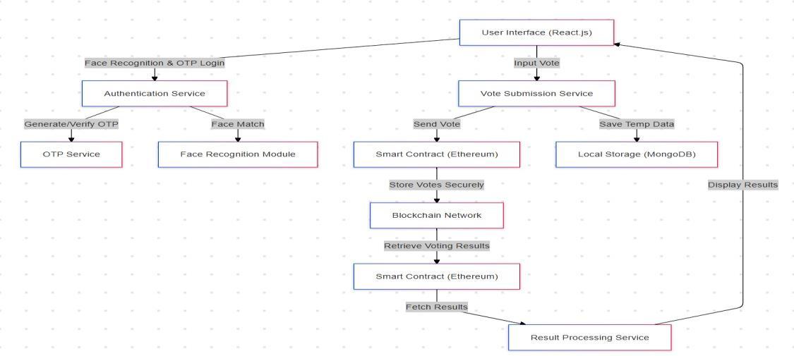 The architecture of this system is designed to ensure a seamless, secure, and efficient voting process. It begins with a React.js-based user interface, which provides an intuitive platform for voters to log in, authenticate, and cast their votes. Multi-layered security is implemented through an authentication service that combines dynamic OTP generation and verificationwithafacerecognitionmodule,ensuringonlylegitimatevoterscanaccessthesystem.Votesarethensubmitted throughasecureservicethatinteractswithsmartcontractsontheEthereumblockchain.Thesesmartcontractsautomate crucial processes such as vote validation and storage on the blockchain network, ensuring data integrity and preventing tampering.Additionally,temporarydataisstoredlocallyinMongoDBtosafeguardagainstnetworkinterruptions.